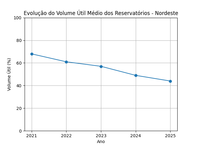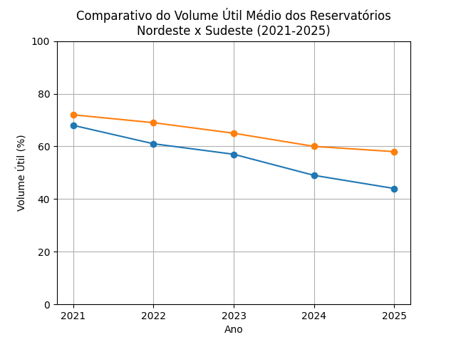 Comparação do volume útil médio dos reservatórios entre Nordeste e Sudeste (2021–2025). A inclinação mais acentuada no Nordeste indica maior vulnerabilidade estrutural no período analisado.
