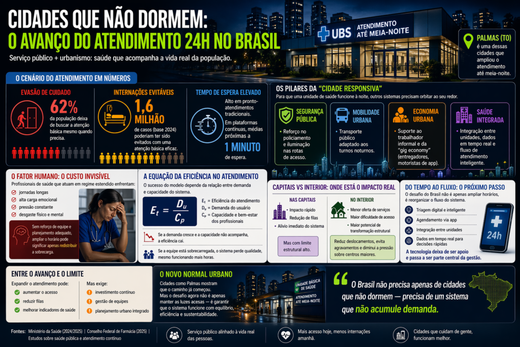 Na saúde, esse movimento já é visível. Em capitais e cidades médias, unidades básicas e serviços intermediários começam a estender o horário até a noite — e, em alguns casos, operam até meia-noite. Em Palmas (TO), a ampliação recente do atendimento noturno em postos de saúde virou símbolo dessa mudança.