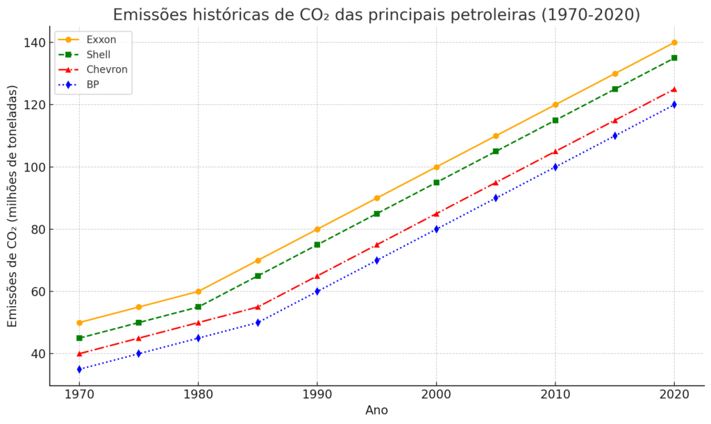 “Mesmo cientes do impacto climático, as principais petroleiras continuaram a ampliar suas emissões. Os dados mostram uma trajetória de crescimento contínuo até a década de 2020.”