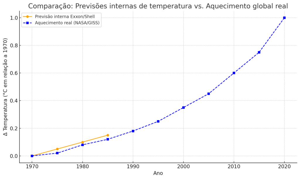 “Os relatórios internos da Exxon e da Shell previam com impressionante precisão o aumento da temperatura global — previsões que hoje coincidem quase exatamente com as medições oficiais da NASA e da NOAA.”