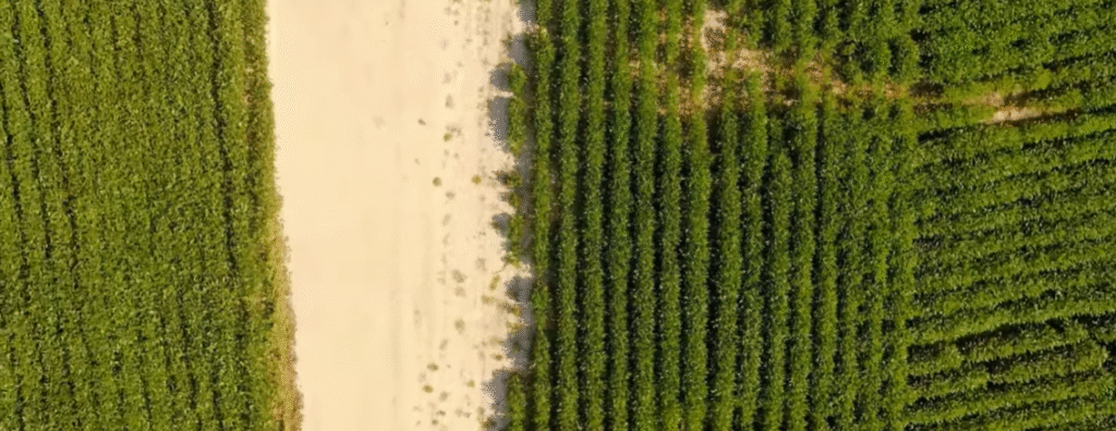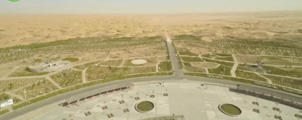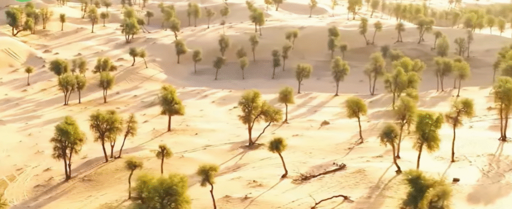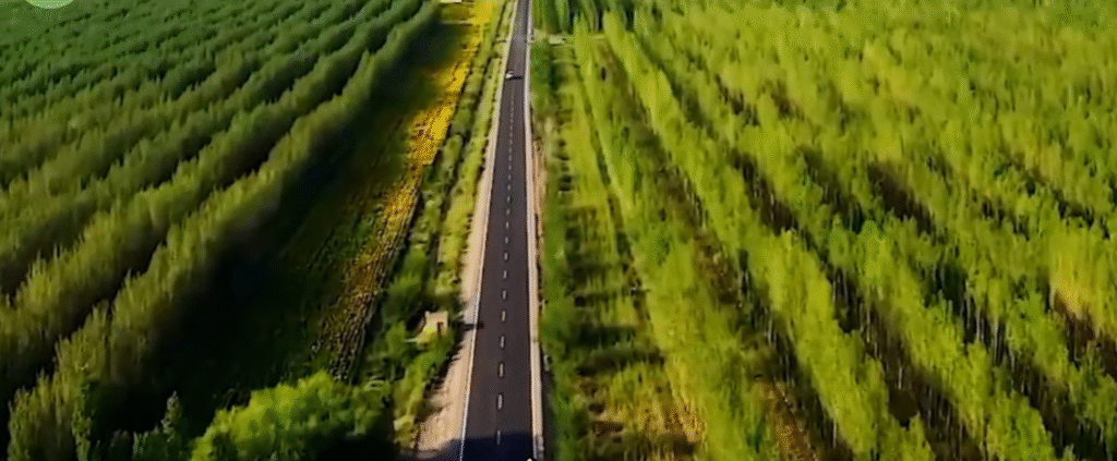 Resultado após 10 anos: faixas verdes cortando o deserto como se alguém tivesse passado um pincel de vida sobre a areia.
