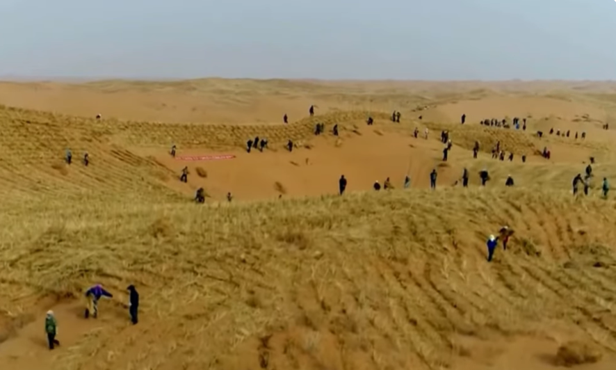 No Deserto de Maowusu, uma das áreas mais severas e áridas da Ásia, equipes chinesas passaram a usar uma técnica no mínimo improvável: enterrar grandes quantidades de madeira, palha e restos vegetais sob as dunas.
