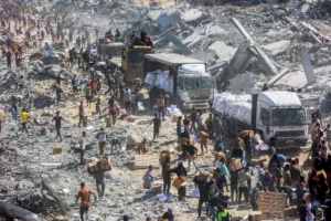 Os caminhões da ajuda humanitária começaram a cruzar, mais uma vez, a fronteira sul de Gaza. Trazem sacos de farinha, caixas de medicamentos e, sobretudo, uma esperança frágil — esperança que precisa se equilibrar sobre ruínas, sobre as sombras das casas que já não existem e sobre o som constante de vozes procurando nomes entre os destroços.