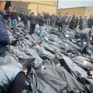 Corpos cobertos por sacos mortuários em imagem que circula nas redes sociais e reforça denúncias de mortes em massa após a repressão aos protestos no Irã.