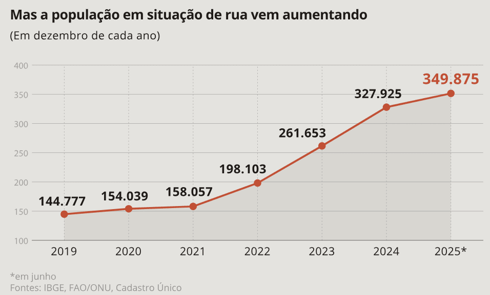 • Crescimento alarmante: Entre 2024 e 2025, o número de pessoas em situação de rua aumentou cerca de 25%, passando de 261 mil para mais de 328 mil.