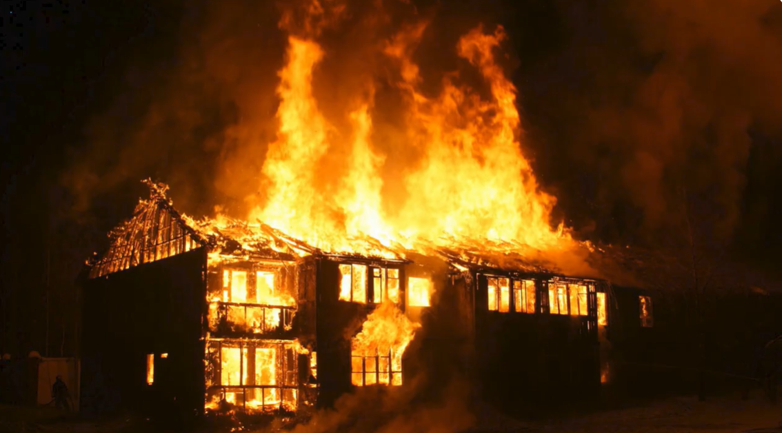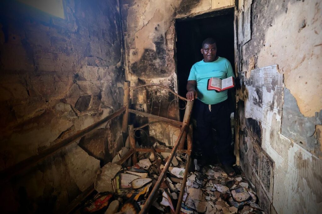 Entre cinzas e restos de uma parede chamuscada, uma Bíblia carbonizada ainda repousa aberta — como se esperasse que alguém voltasse a ler o último salmo.