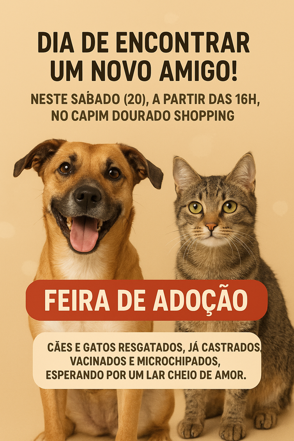 A Prefeitura de Palmas, por meio da Secretaria Municipal de Proteção e Bem-Estar Animal (Sebem), promove neste sábado, 20, a partir das 16 horas, mais uma edição da feira de adoção de cães e gatos no espaço pet do Capim Dourado Shopping.