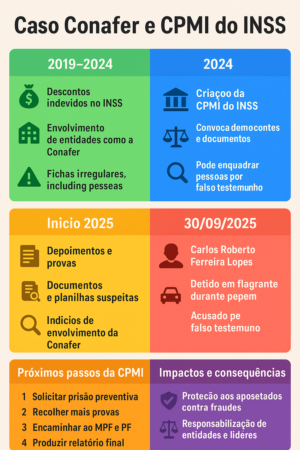 Na madrugada desta terça-feira (30), Carlos Roberto Ferreira Lopes, presidente da Confederação Nacional dos Agricultores Familiares e Empreendedores Familiares Rurais (Conafer), foi detido em flagrante durante seu depoimento à Comissão Parlamentar Mista de Inquérito (CPMI) do INSS. A prisão foi decretada pelo presidente da comissão, senador Carlos Viana (Podemos-MG), após acusações de falso testemunho.