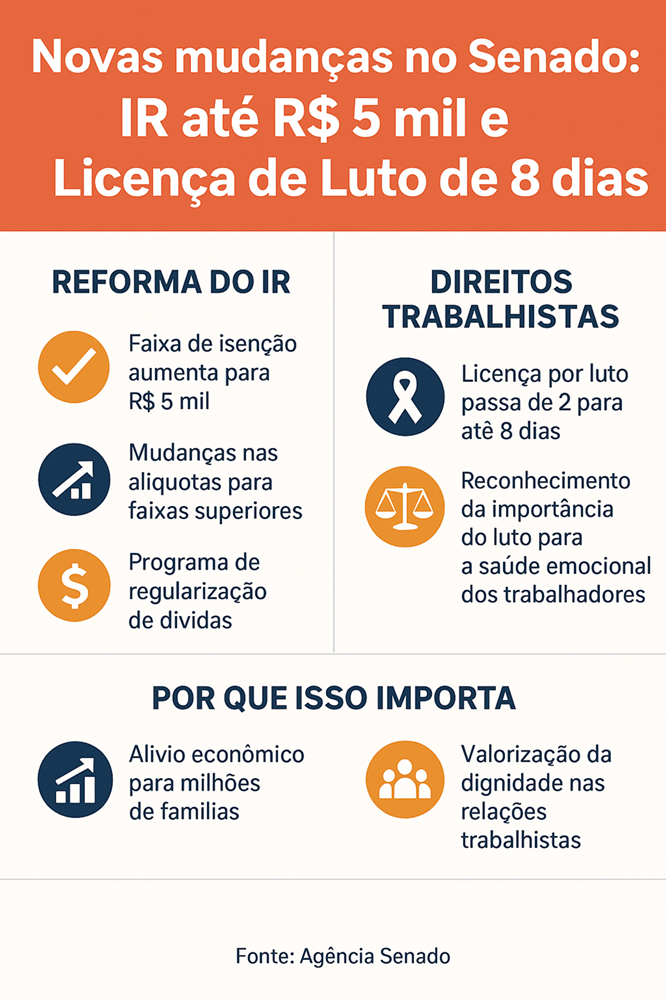 Há decisões políticas que parecem simples mudanças legislativas, mas que, no fundo, revelam um reposicionamento profundo sobre qual país queremos construir. A aprovação no Senado dos projetos que isenta do Imposto de Renda quem ganha até R$ 5 mil e que amplia a licença por luto de dois para até oito dias é uma dessas decisões. Pequenas linhas em textos legais, sim. Mas também um raro sopro de racionalidade e sensibilidade social em tempos de tanta frieza institucional.