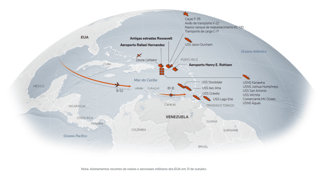 O envio do USS Gerald Ford, o maior porta-aviões do planeta, para a região, e a reativação de uma base naval americana em Porto Rico — desativada há 20 anos — levantaram o alerta vermelho em várias capitais latino-americanas. A ilha fica a apenas 800 quilômetros da Venezuela, onde o regime de Nicolás Maduro segue resistindo às pressões internacionais.